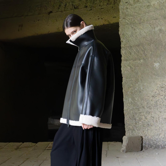 合皮ながらも本革のような光沢となめらかさのあるフェイクレザーとボアをドッキングした、ユニセックスなルックスのコート。