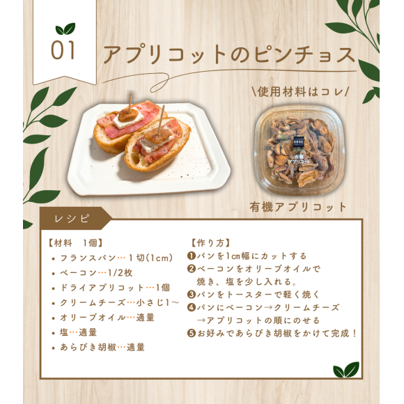ドライフルーツの有機アプリコットを使用したピンチョス