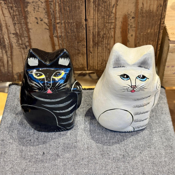 インドの伝統工芸である紙粘土細工(ペーパーマッシュ)にハンドペイントを施した招き猫の置き物です。
