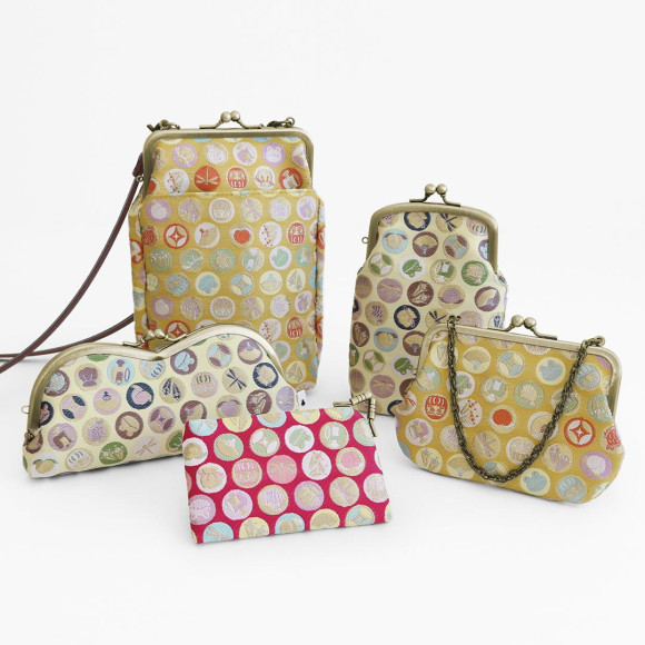 かえるや七宝、だるまなど、縁起の良いモチーフを取り入れたオリジナルデザインを、金糸を使ったジャガード生地に仕上げたシリーズ。ソフトな色合いにキラキラ輝く金糸が絶妙にマッチした、華やかな「黄金色・鳥の子色・桃紅色」の3色展開です。幸運を運んでくれそうな縁起の良い柄で、プレゼントにもおすすめです。