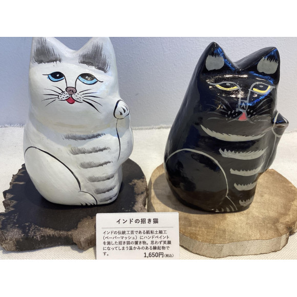 インドの伝統工芸である紙粘土細工(ペーパーマッシュ)にハンドペイントを施した招き猫の置き物です。