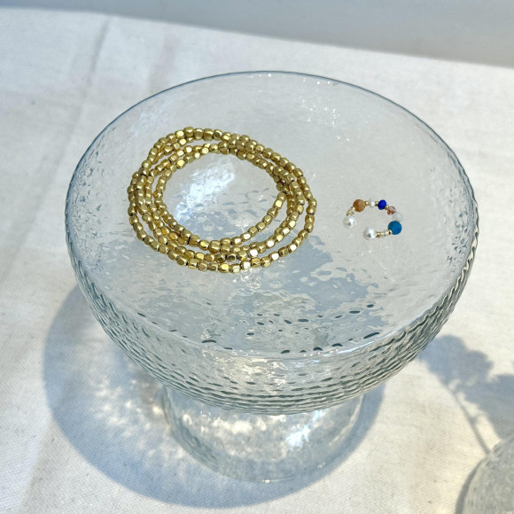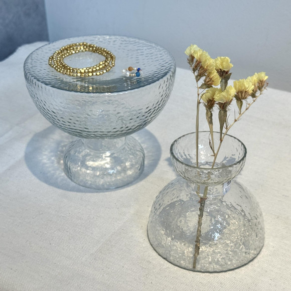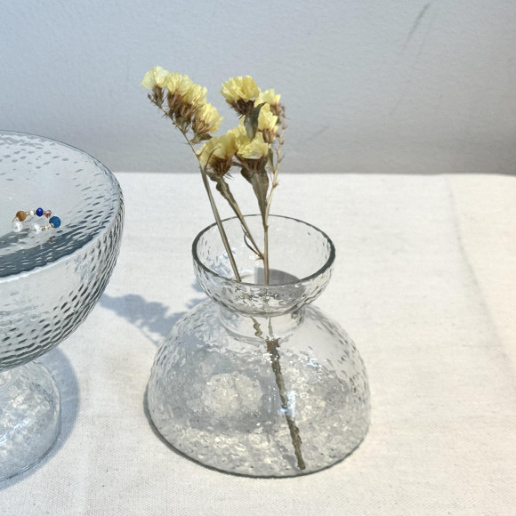 小ぶりなガラスコップのような形が印象的なガラスのスタンドトレイです。