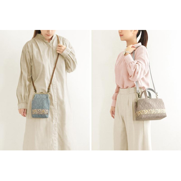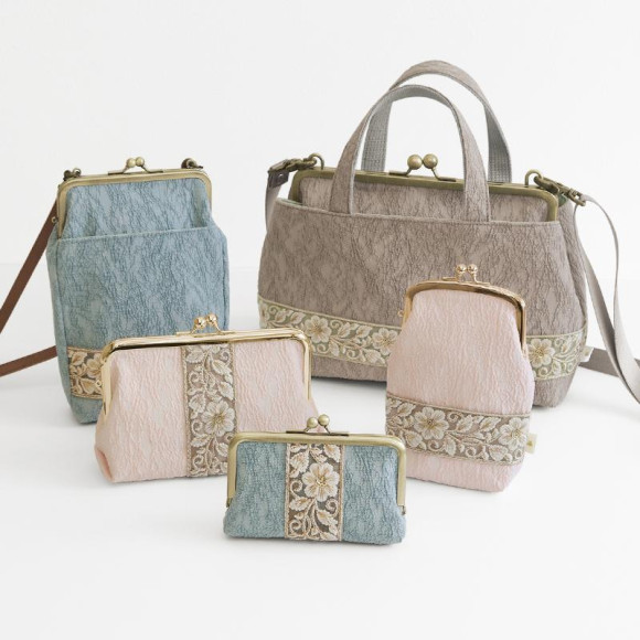 バッグアイテムは、人気のお散歩ポシェットと新型『がま口手提げ&ショルダー』ご用意しました。※『がま口手提げ&ショルダー』は、ブルー・ベージュの2色展開です。
